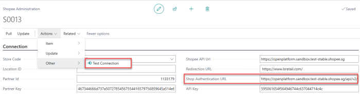 - In LS Central, navigate to Actions - Other - Test Connection to generate a URL in the Shop Authentication URL field. Copy the URL, open it in a browser, and complete the authorization process.