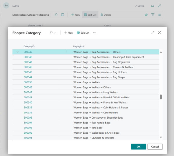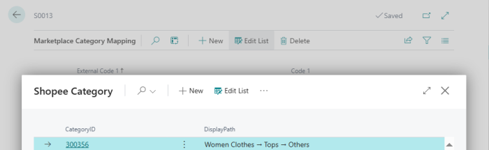 - Open the Shopify Administration page, go to Related - Mapping - Marketplace Category, and on the mapping page select the appropriate Category ID and code for the product you want to send to Shopee (for example, “40040 - Blouse Linda professional wear”); refer to the screenshot for details.