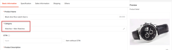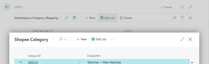 - Open the Shopify Administration page, go to Related - Mapping - Marketplace Category, and on the mapping page select the appropriate Category ID and code for the product you want to send to Shopee (for example, “40210 - Black dice flow watch Davi-s”); refer to the screenshot for details.