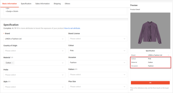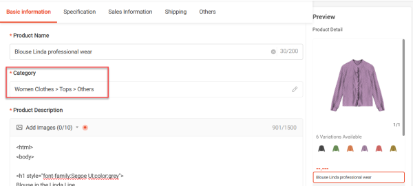 - Open the Shopee sandbox or live Shopee Seller Center, navigate to Product - My Products, and view the product “40040 - Blouse Linda professional wear”. As illustrated in the screenshots below, showing that the category and attributes were successfully sent to Shopee.
