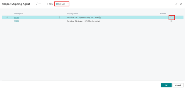 Maps LS Central Shipping Agents to Shopee logistics options. When creating an item, at least one logistics option must be enabled. In the Sandbox environment, logistics are disabled by default, so you must enable at least one option in LS Central before proceeding.