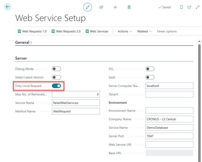 To In the Web Service Setup page, you can configure how LS Central communicates through web services. If you want to restrict communication so that only the local server can send and receive requests, enable the Only Local Request option.
