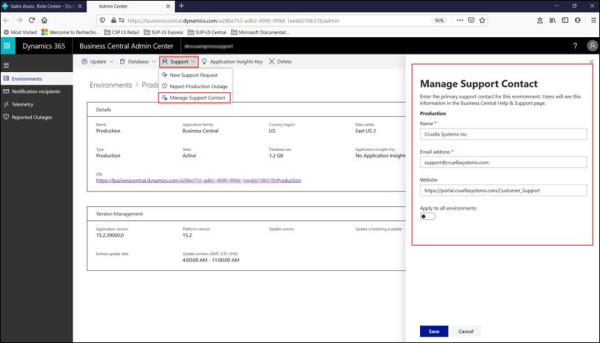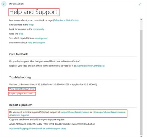 If needed, the Internal Admin can use the technical information on the Help and Support page from within the Business Central application.